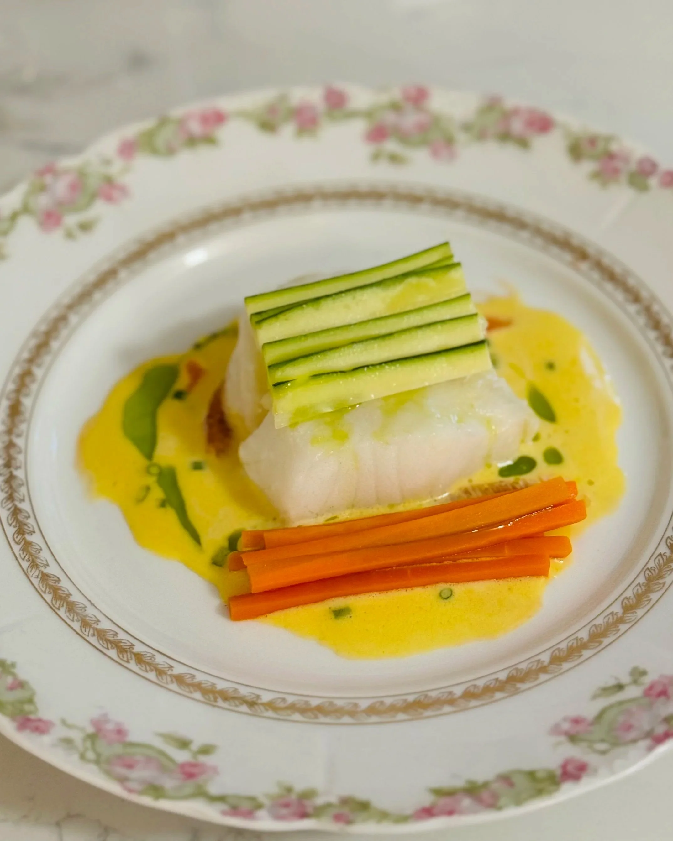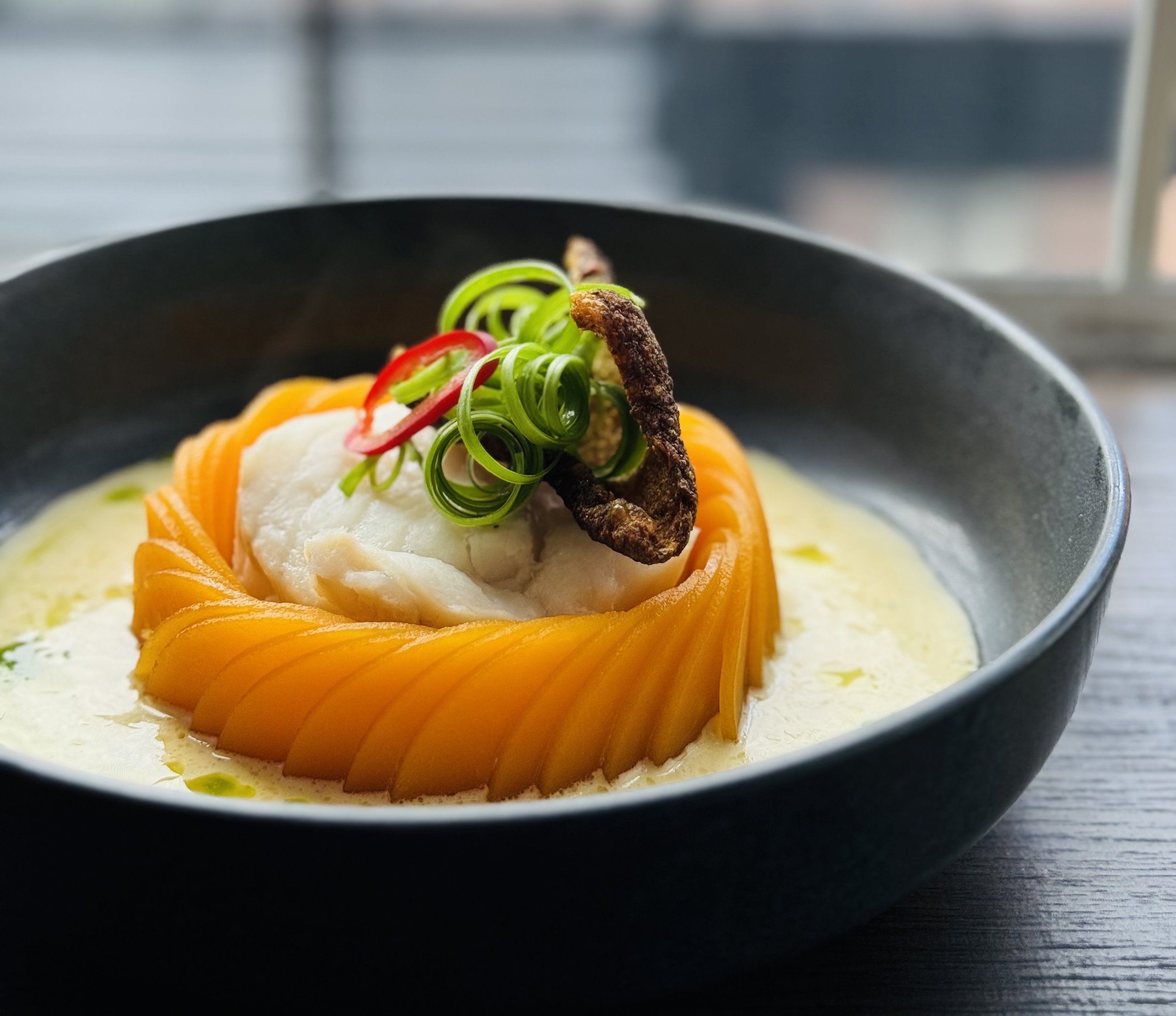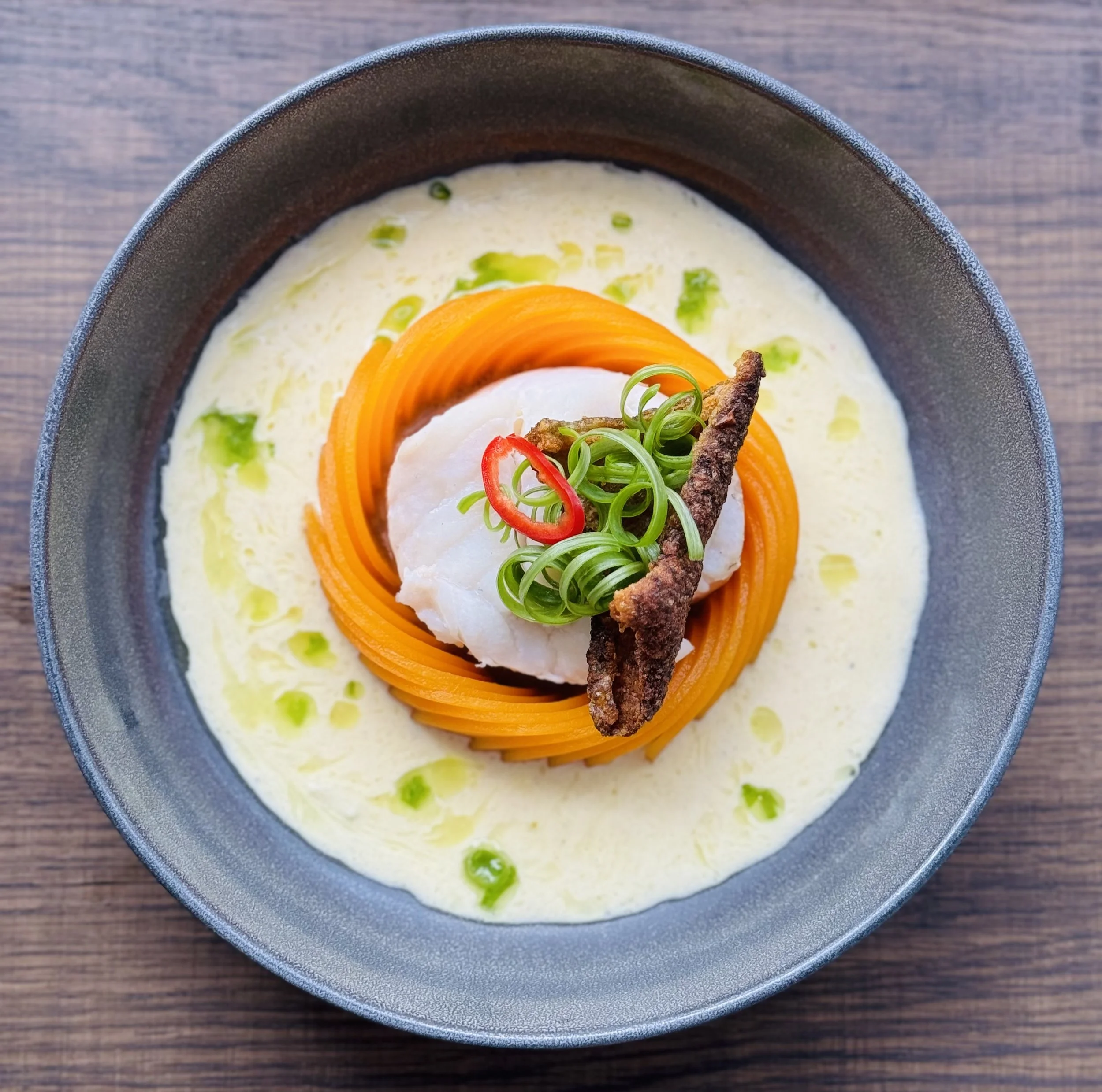 Sweet and sour butternut squash, lemon cream, crispy sea bass skin