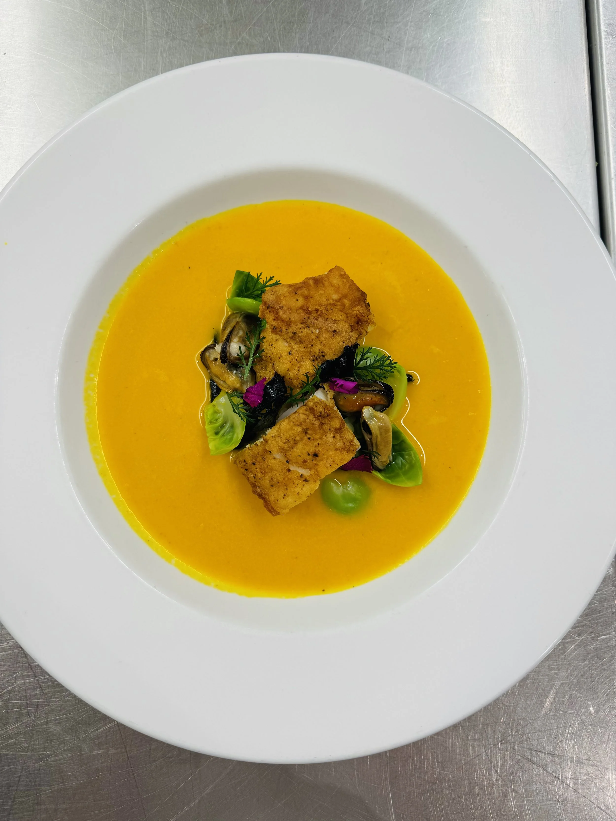 Turmeric coconut cream, smoked mussels, Brussels sprouts