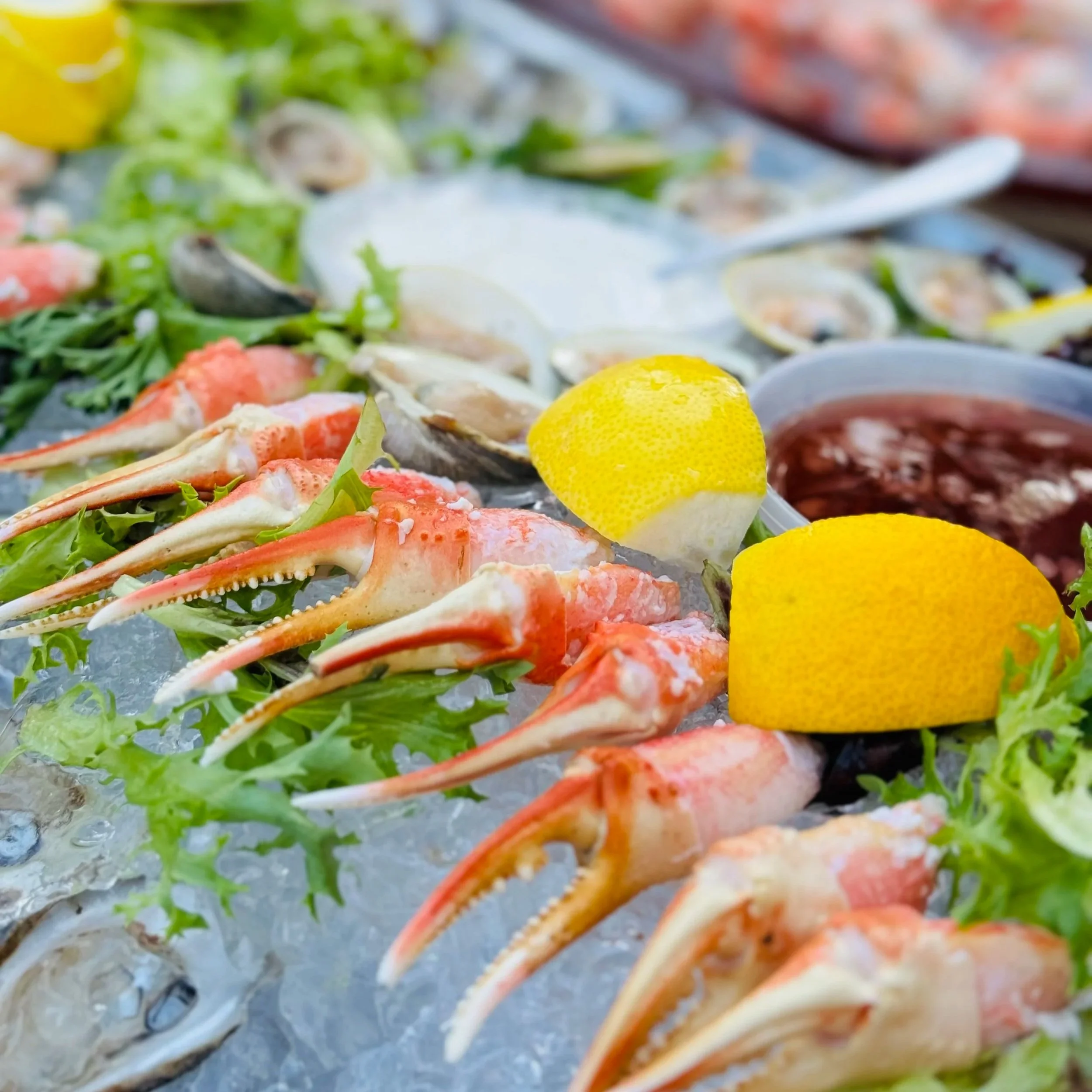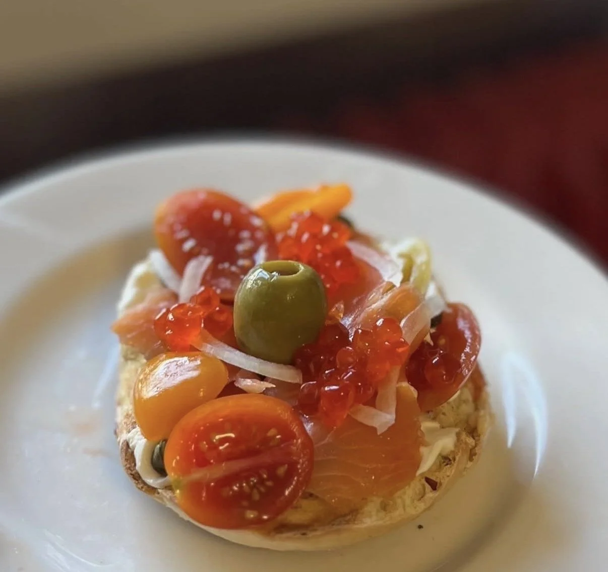 Lox, cherry tomato, olive, onion, capers, cucumber, ikura, crème fraîche