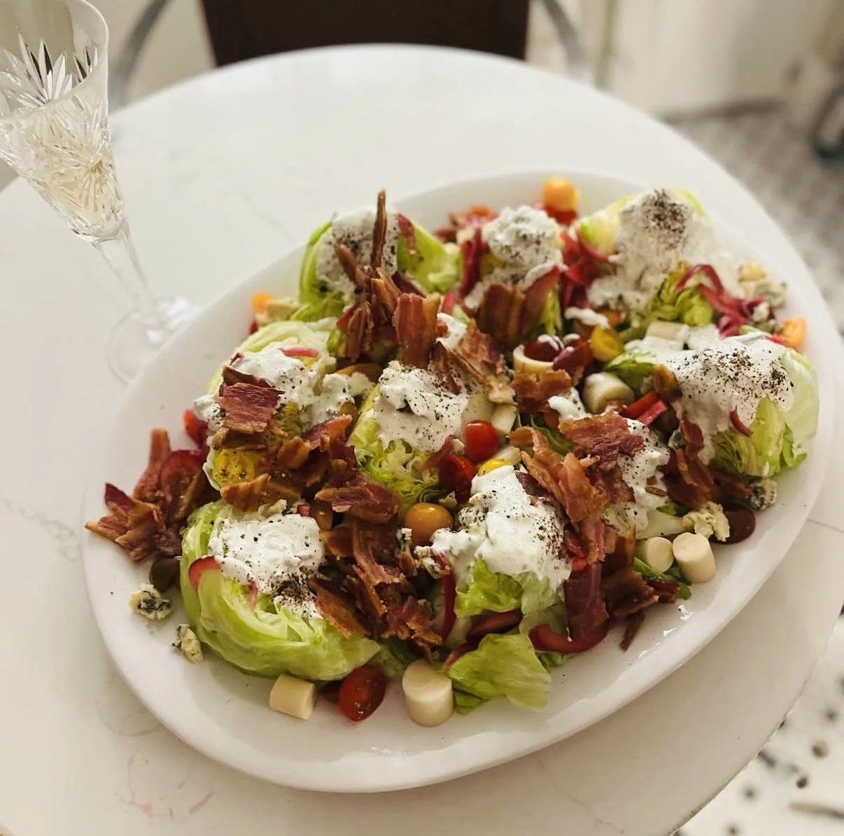 Iceberg, cherry tomato, bacon, blue cheese, hearts of palm, pumpkin seeds, dried cranberry, red onion, blue cheese dressing